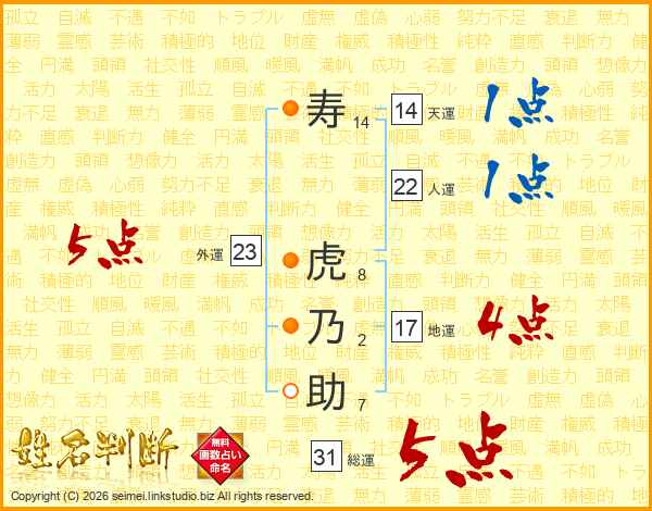 寿(14画) 虎(8画)乃(2画)助(7画)
