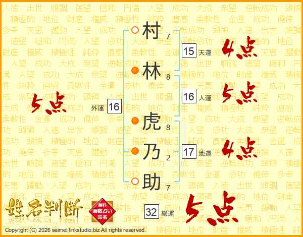 村(7画)林(8画) 虎(8画)乃(2画)助(7画)