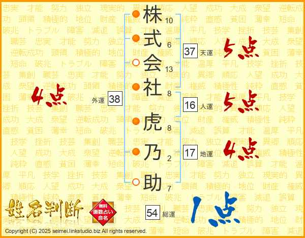 株(10画)式(6画)会(13画)社(8画) 虎(8画)乃(2画)助(7画)