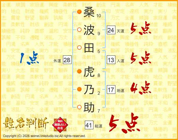 桑(10画)波(9画)田(5画) 虎(8画)乃(2画)助(7画)