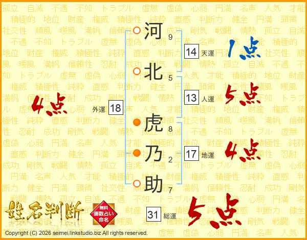 河北虎乃助さんの総運は31画の5点!