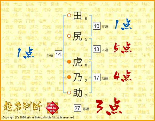 田(5画)尻(5画) 虎(8画)乃(2画)助(7画)