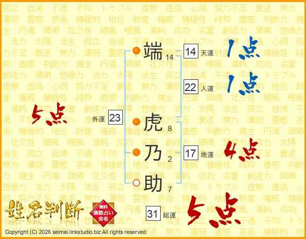 端虎乃助さんの総運は31画の5点!