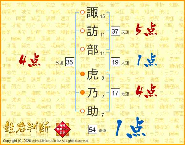 諏(15画)訪(11画)部(11画) 虎(8画)乃(2画)助(7画)