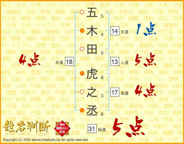 五(5画)木(4画)田(5画) 虎(8画)之(3画)丞(6画)
