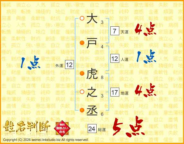 大(3画)戸(4画) 虎(8画)之(3画)丞(6画)