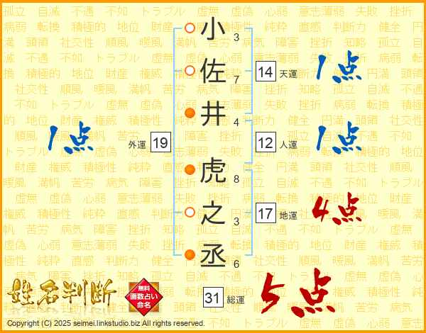 小(3画)佐(7画)井(4画) 虎(8画)之(3画)丞(6画)