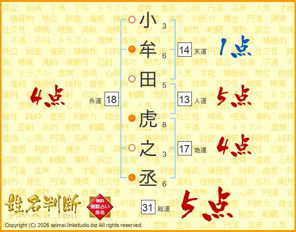 小(3画)牟(6画)田(5画) 虎(8画)之(3画)丞(6画)
