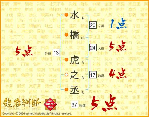 水橋虎之丞さんの総運は37画の5点!