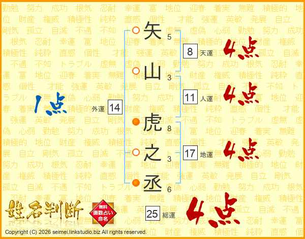 矢山虎之丞さんの総運は25画の4点!