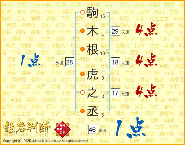 駒(15画)木(4画)根(10画) 虎(8画)之(3画)丞(6画)