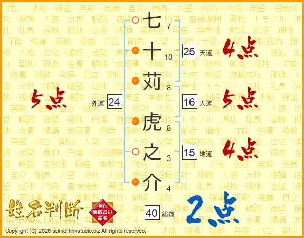 七(7画)十(10画)苅(8画) 虎(8画)之(3画)介(4画)