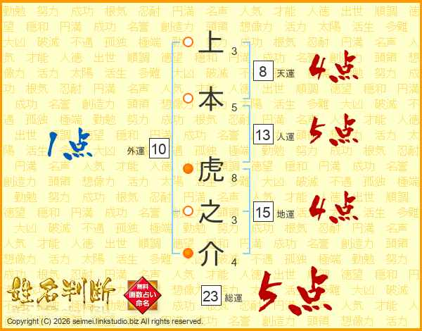 上本虎之介さんの人運は13画の5点!