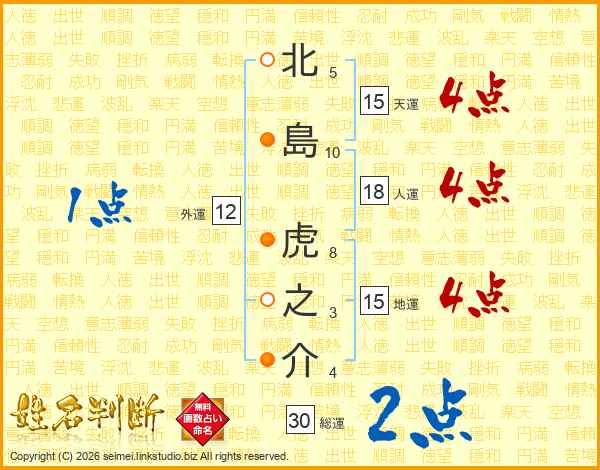 北(5画)島(10画) 虎(8画)之(3画)介(4画)