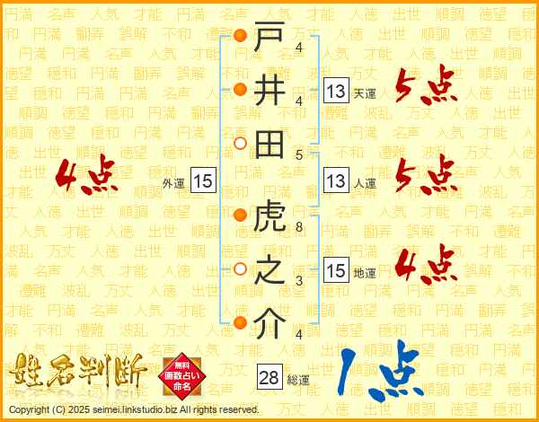 戸(4画)井(4画)田(5画) 虎(8画)之(3画)介(4画)