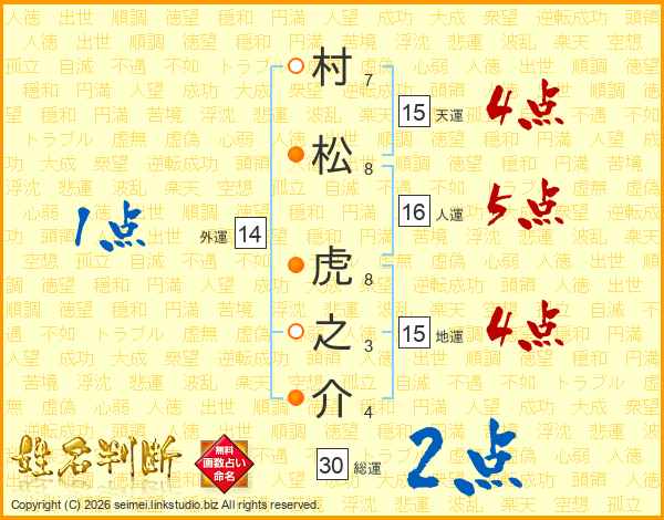 村(7画)松(8画) 虎(8画)之(3画)介(4画)