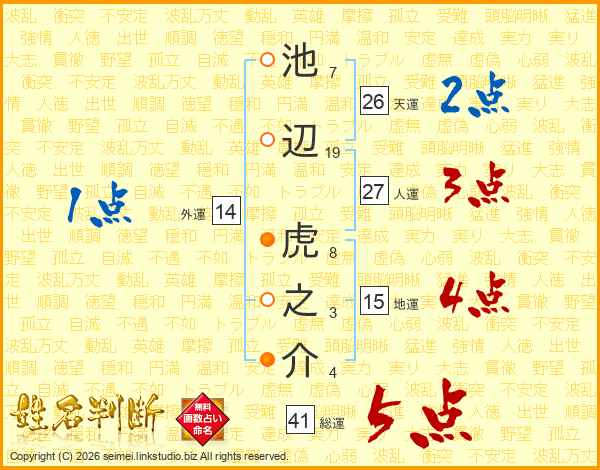池(7画)辺(19画) 虎(8画)之(3画)介(4画)