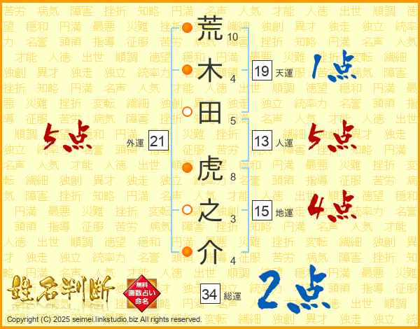 荒(10画)木(4画)田(5画) 虎(8画)之(3画)介(4画)