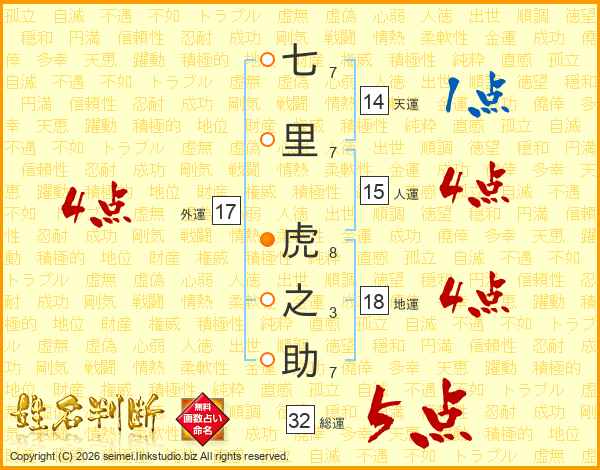 七(7画)里(7画) 虎(8画)之(3画)助(7画)