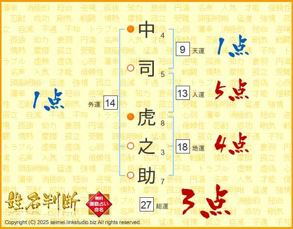 中(4画)司(5画) 虎(8画)之(3画)助(7画)