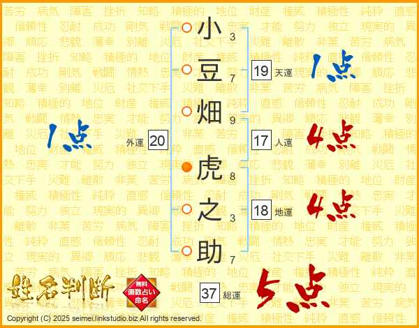 小(3画)豆(7画)畑(9画) 虎(8画)之(3画)助(7画)