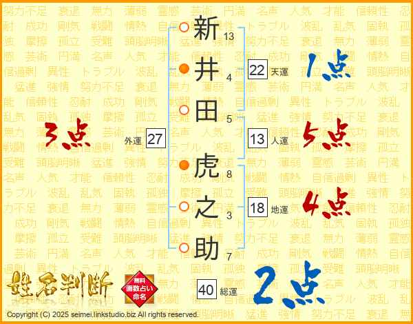 新(13画)井(4画)田(5画) 虎(8画)之(3画)助(7画)