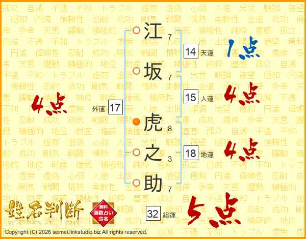 江(7画)坂(7画) 虎(8画)之(3画)助(7画)
