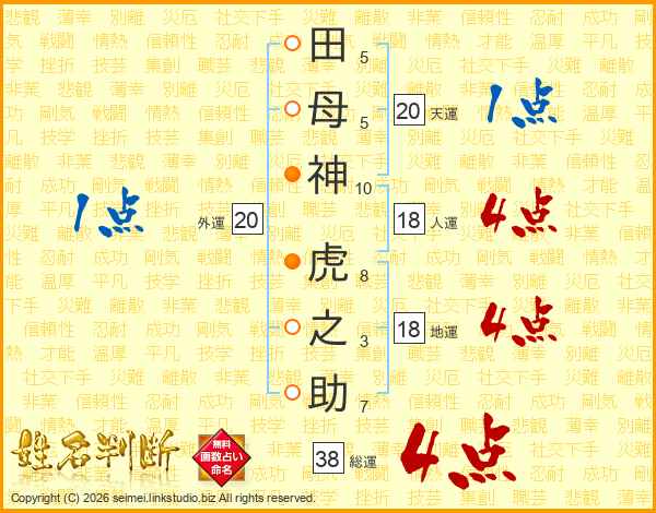 田(5画)母(5画)神(10画) 虎(8画)之(3画)助(7画)
