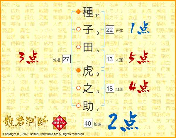 種(14画)子(3画)田(5画) 虎(8画)之(3画)助(7画)