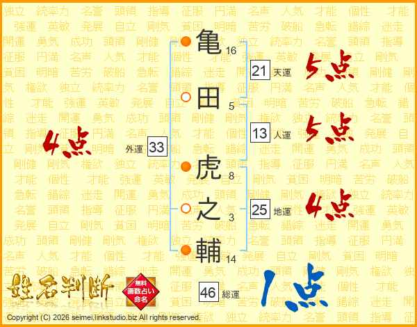 亀(16画)田(5画) 虎(8画)之(3画)輔(14画)