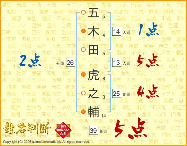 五(5画)木(4画)田(5画) 虎(8画)之(3画)輔(14画)