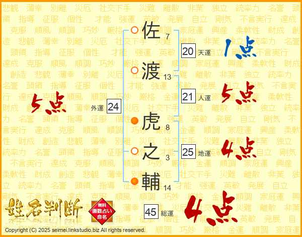 佐(7画)渡(13画) 虎(8画)之(3画)輔(14画)