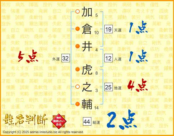 加(5画)倉(10画)井(4画) 虎(8画)之(3画)輔(14画)