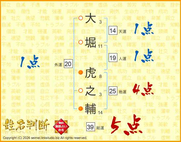 大(3画)堀(11画) 虎(8画)之(3画)輔(14画)