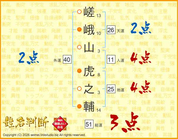 嵯(13画)峨(10画)山(3画) 虎(8画)之(3画)輔(14画)