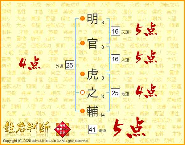 明(8画)官(8画) 虎(8画)之(3画)輔(14画)