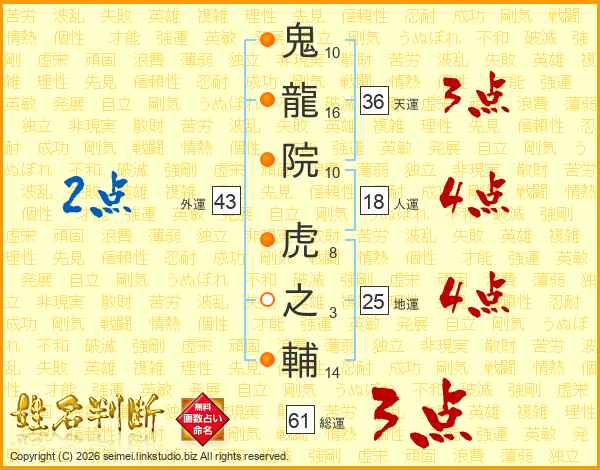 鬼龍院虎之輔さんの総運は61画の3点!