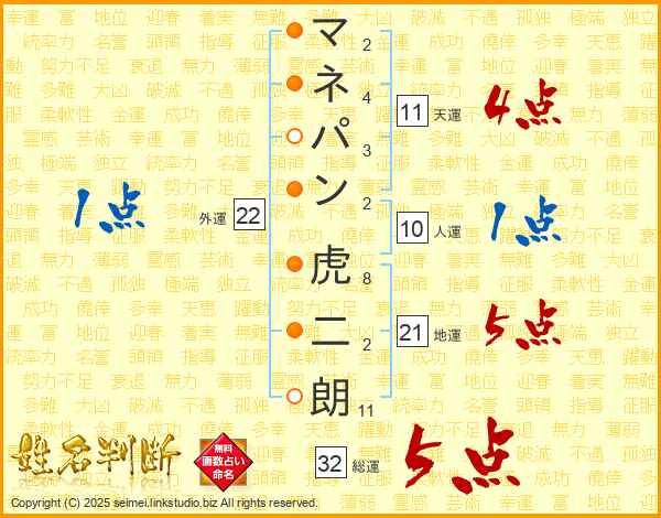 マ(2画)ネ(4画)パ(3画)ン(2画) 虎(8画)二(2画)朗(11画)