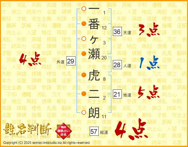 一番ヶ瀬虎二朗さんの総運は57画の4点!