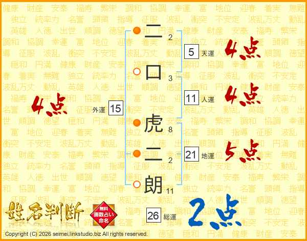 二口虎二朗さんの総運は26画の2点!