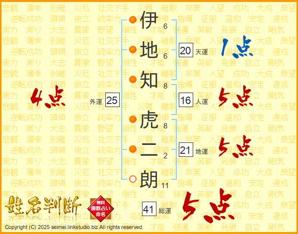 伊(6画)地(6画)知(8画) 虎(8画)二(2画)朗(11画)