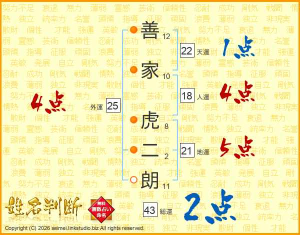 善家虎二朗さんの総運は43画の2点!