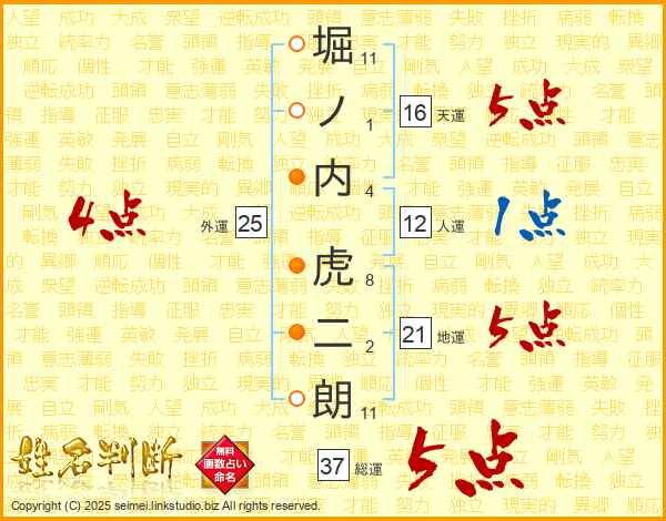 堀(11画)ノ(1画)内(4画) 虎(8画)二(2画)朗(11画)