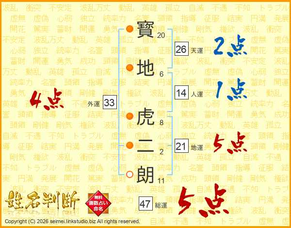寳地虎二朗さんの総運は47画の5点!