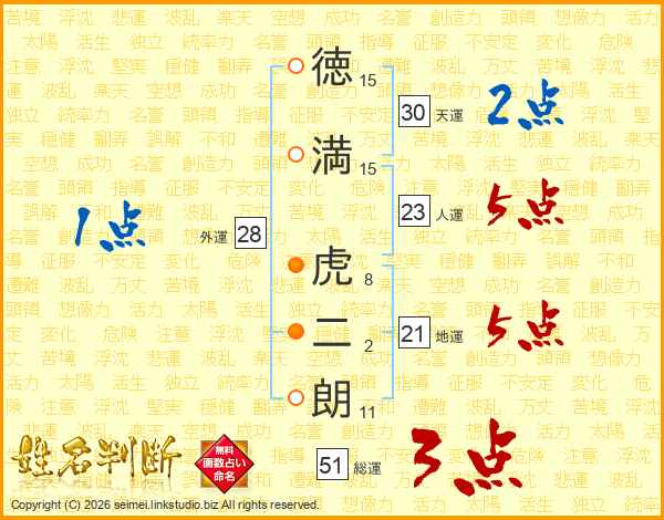 徳(15画)満(15画) 虎(8画)二(2画)朗(11画)