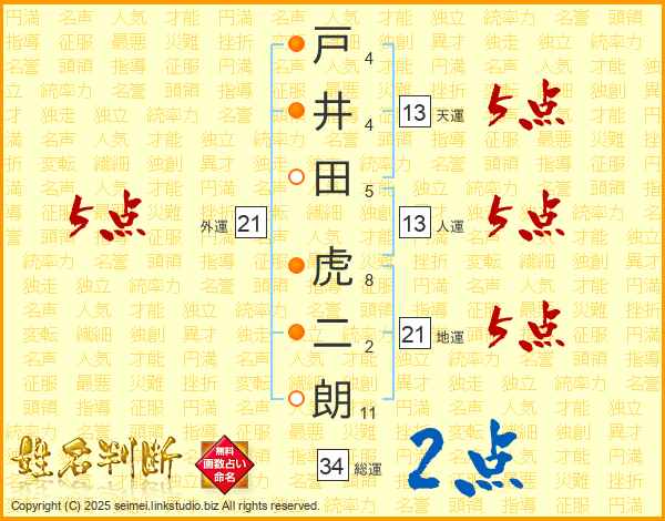 戸(4画)井(4画)田(5画) 虎(8画)二(2画)朗(11画)