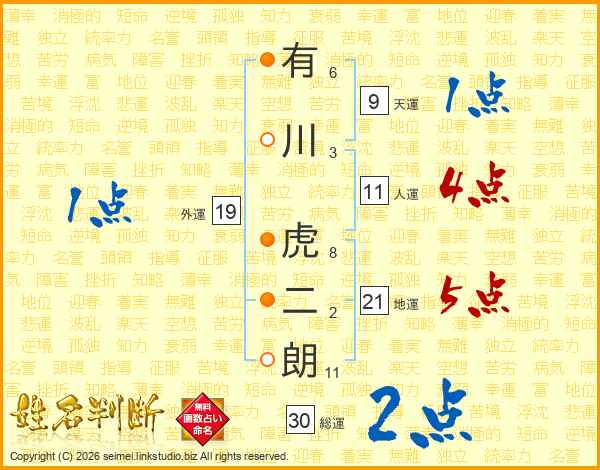 あなたの人生を表す1番重要な運勢です。生涯を通じて影響する総合運となり、主に50歳以降の晩年期に影響を及ぼします。苗字と名前の合計画数。
