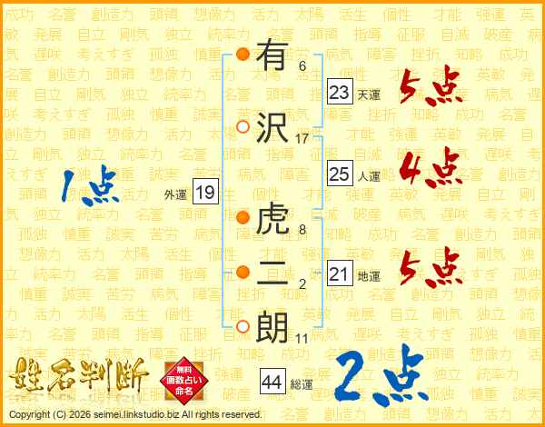 有(6画)沢(17画) 虎(8画)二(2画)朗(11画)