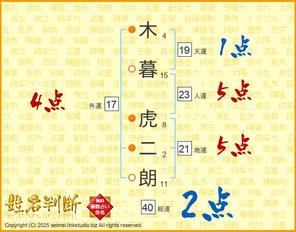 木(4画)暮(15画) 虎(8画)二(2画)朗(11画)