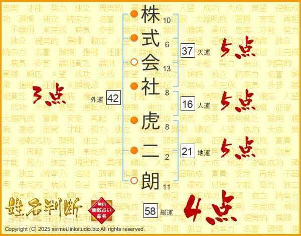 株式会社虎二朗さんの総運は58画の4点!